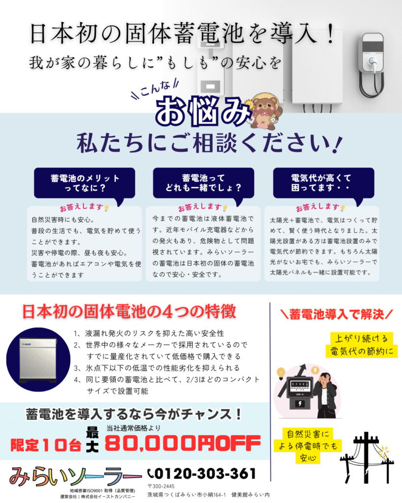特に、今回ご紹介する 日本初の「固体蓄電池」 は安全性が高く、液漏れや発火リスクが少ない最新モデルで、ご家庭でも安心して使えると大変好評です。